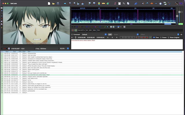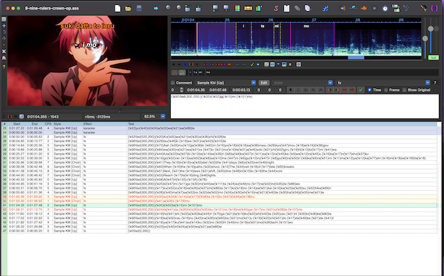 there is this anisong I really like, but I can't find any karaoke of it, so I'll make one! using Aegissub, a subtitles app, but I'm quite unsettled by it. I expected some tempo timing to be involved, but it relies fully on visual cues for syllable sync!